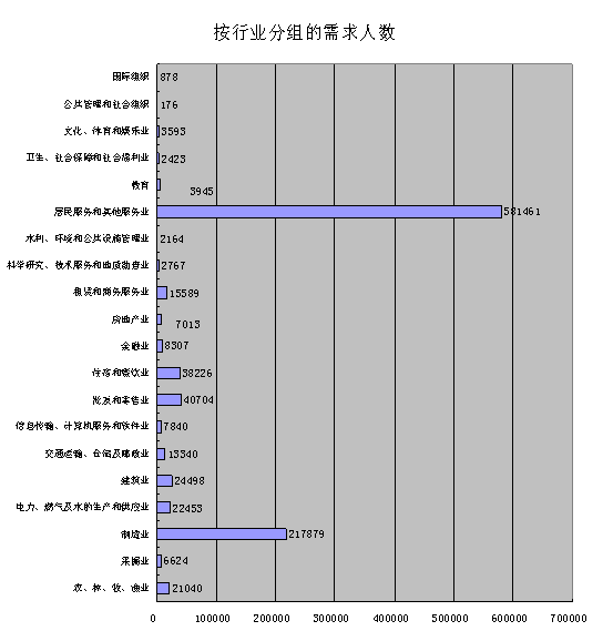 从行业需求来看:居民服务和其他服务业、制造业、批发和零售业占据着各行业中用工量的前三位。居民服务和其他服务业占56.95%排在第一,制造业占21.34%位居第二位,批发和零售业占3.99%排在第三。