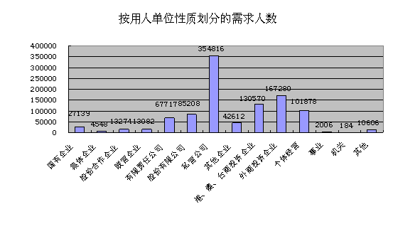 从用人单位性质来看:私营公司、外商投资企业、港澳台商投资企业为用工需求量前三位的用人单位,用工需求量分别占需求总量的34.75%、16.39%、12.79%,内资企业需求总量为60.8万人次,所占比重达到59.59%。
