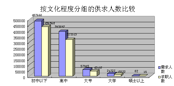 从文化程度上看,高中和初中以下学历的求职人员占求职总数的86.35%。整个人力资源供给市场学历仍相对较低,人力资源供给的素质结构需要进一步提升。